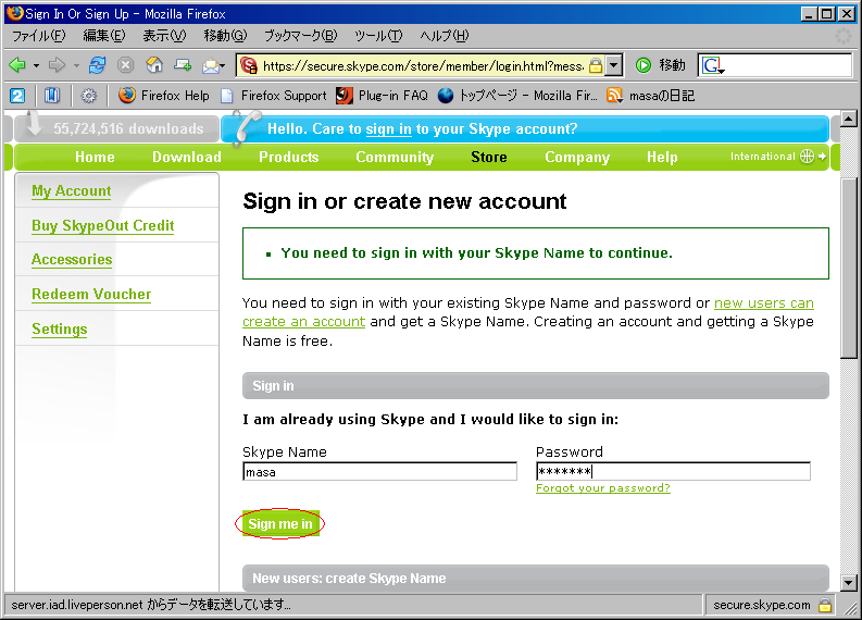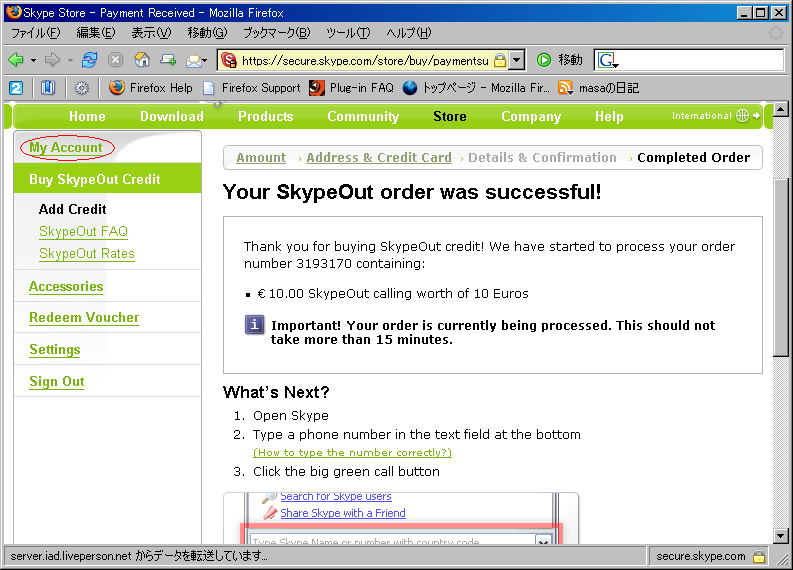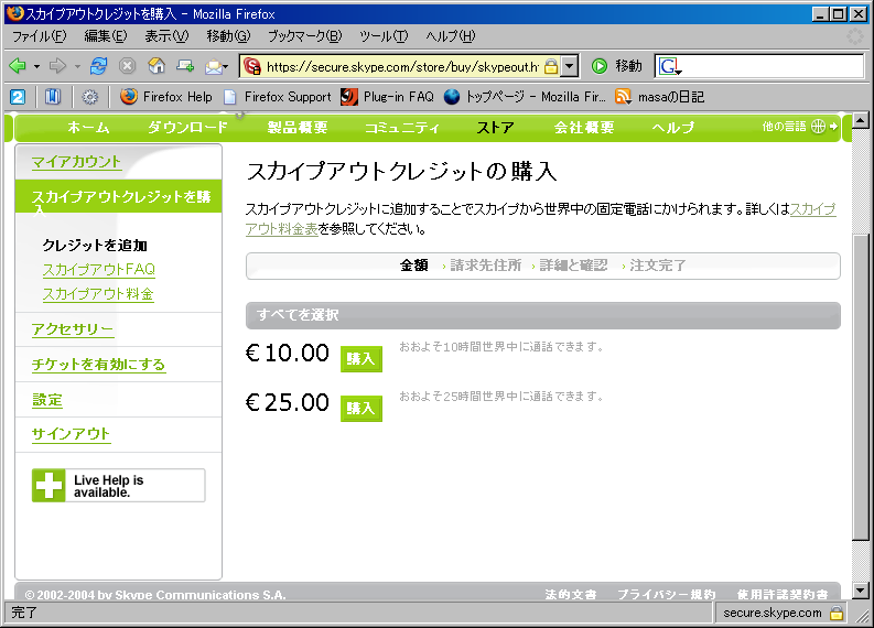 | SkypeOut日本語表示の購入方法です。クレジットカードは国外でも使える国際クレジットカードを準備してください。 この方法は、正式にアナウンスされているものではありません。 ※追記 スカイプのメインメニューの「ツール」より「マイアカウントにサインイン」もしくは「スカイプアウトクレジット購入」をクリックする事で日本語のページに飛ぶようになってました。いつの間に変わっていたのだろう。 https://secure.skype.com/store/member/login.html?setlang=ja 上記のアドレスをクリックします。 |