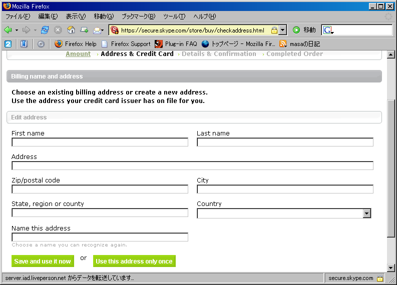 記入方法 First name:名(例:TARO) Last name:姓(例:YAMADA) Address:市町村より後の住所(例:丸町123-4-5なら123-4-5 Maru-machi) Zip/postal code:郵便番号(例:123-4567) City:市町村名(例:Tosashimizu-shi) State,region or county:都道府県名(例:kochi) Country:国名(例:Japan) Name this address:(特に記入の必要なし) 記入が終われば、次回購入時に入力の手間を省くのなら「Save and use it now」をクリックすると記録されます。 「Use this address only once」をクリックすると記録されず次回購入時にまた入力する必要があります。 住所の入力に不安な方は、infoseekの翻訳サイトを利用すると良いでしょう。 記入後の画像をみたい方はここをクリック |