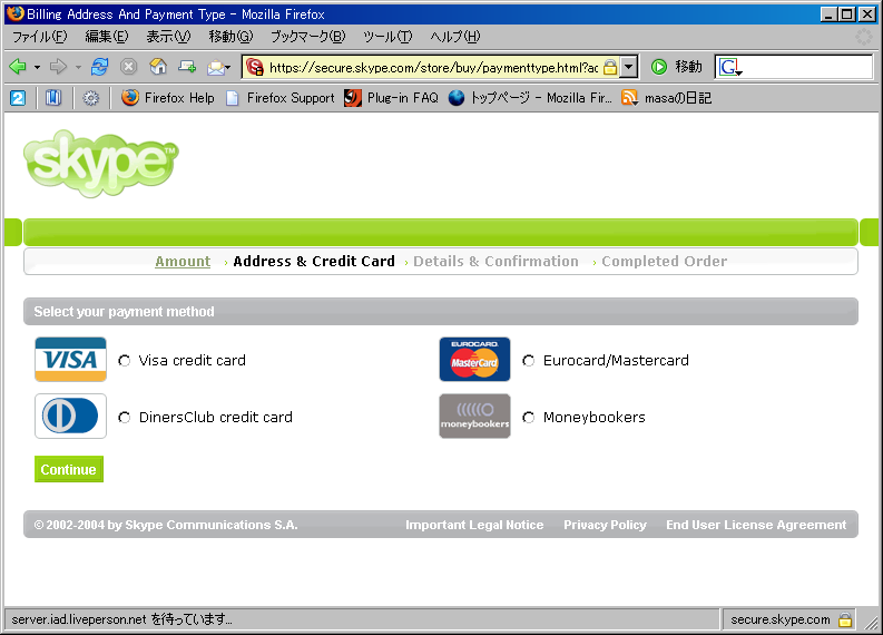 ![]() | 使用するクレジットカード(Visa Mastercard DinersClub)を選択して、「Continue」をクリックしてください。 Moneybookersしか表示されない時がありました。時間をあけて再度試すとすべて表示されました。 左の画面には入っていませんが、PayPalも選べれるようになっています。 |