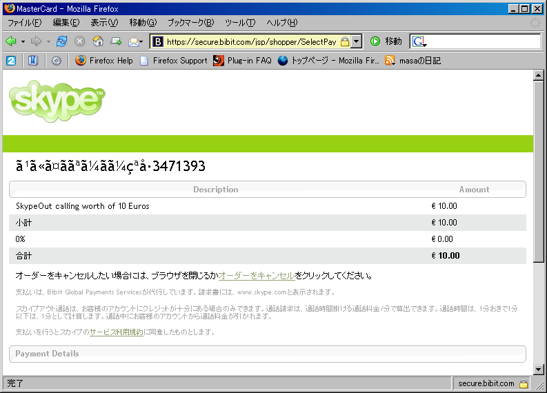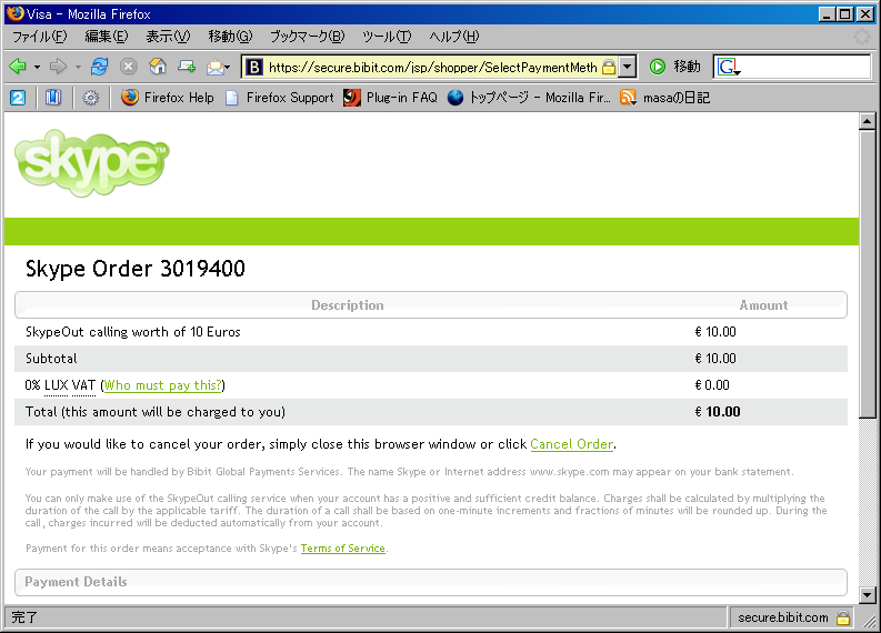 | JAL CARD VISA | 4534 | 無 | 成功 | Lunascape 2.0.2a | 米国滞在中に使用していましたが、SkypeOut購入を頻繁にし過ぎると(2日に1回等)カードでの購入を選択できなくなります(MoneyBookersのみ選択可能となる) |