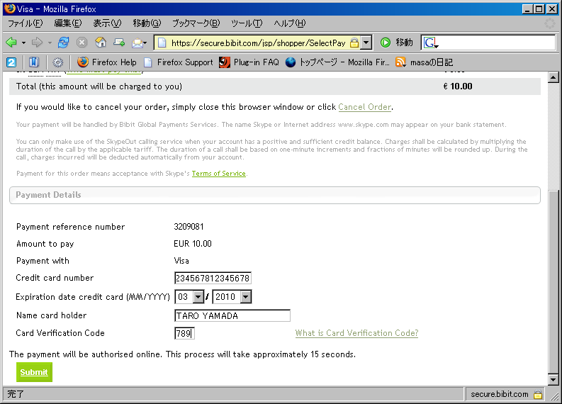 Credit card number:クレジット番号16桁をスペースを空けずに入力(例:1234 5678 1234 5678なら「1234567812345678」) Expiration date credit card(MM/YYYY):クレジットカードの有効期限を月、年の順番に入力 Name card holder:クレジットカードに記載されているローマ字の名前を記入(例:TARO YAMADA) Card Verification Code:カード立証コード、ほとんどのカードでは、カード裏の署名欄に記載されている番号の内最後3桁の番号。 記入が終われば「Submit」をクリック。 記入後の画像をみたい方はここをクリック |