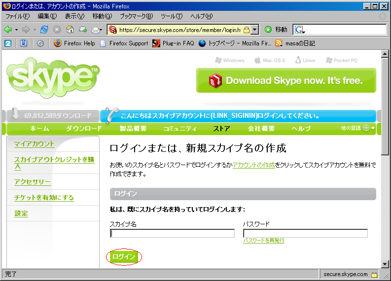 ![]() | Skype導入時に設定した「スカイプ名」と「パスワード」を入れた後、赤丸で囲んでいる「ログイン」をクリックしてください。 |