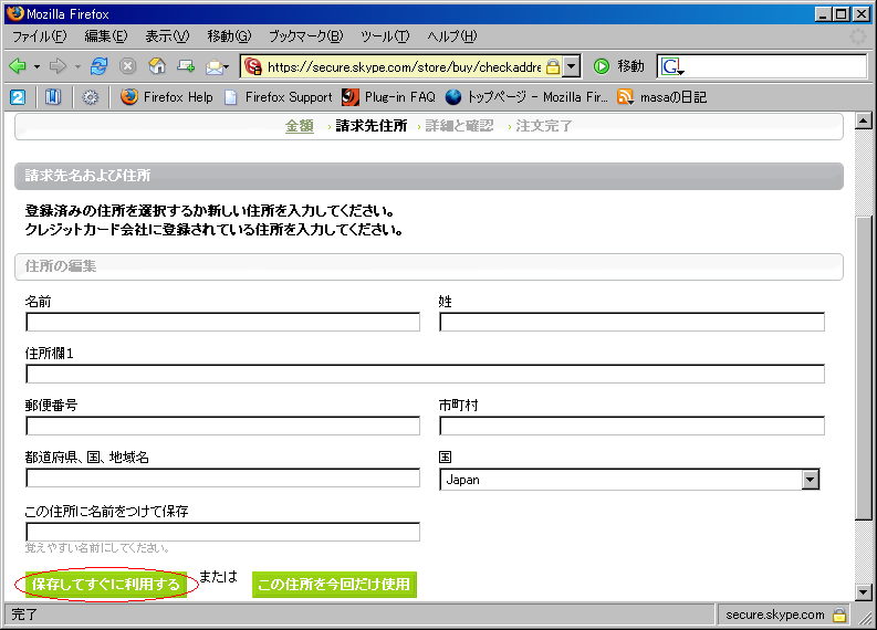 記入方法 名前:(例:太郎) 姓:(例:山田) 住所欄1:市町村より後の住所(例:丸町123-4-5) 郵便番号:(例:123-4567) 市町村:(例:土佐清水市) 都道府県、国、地域名(例:高知県) 国:(例:Japan) この住所に名前を付けて保存:(特に記入の必要なし) 記入が終われば、次回購入時に入力の手間を省くのなら「保存してすぐに利用する」をクリックすると保存されます。 「この住所を今回だけ使用」をクリックすると記録されず次回購入時にまた入力する必要があります。 漢字で入力しても通りました。ただし、請求書など文字化けしますので出来る事なら、半角英数字で入力した方が良いかもしれません。 |