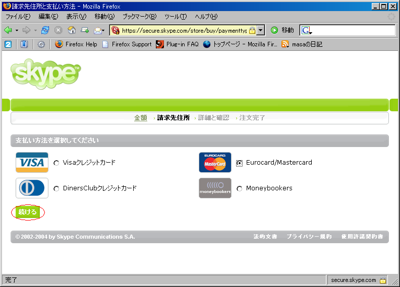 ![]() | 使用するクレジットカード(Visa Mastercard DinersClub)を選択して、赤丸で囲んだ「続ける」をクリックしてください。 Moneybookersしか表示されない時がありました。時間をあけて再度試すとすべて表示されました。 左の画面には入っていませんが、PayPalも選べれるようになっています。 |