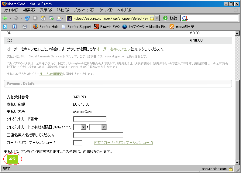 クレジット番号:クレジット番号16桁をスペースを空けずに入力(例:1234 5678 1234 5678なら「1234567812345678」) クレジットカードの有効期限日(MM/YYYY):クレジットカードの有効期限を月、年の順番に入力 口座名義任命を示してください。:クレジットカードに記載されているローマ字の名前を記入(例:TARO YAMADA) カード ベリフィケーション コード:カード立証コード、ほとんどのカードでは、カード裏の署名欄に記載されている番号の内最後3桁の番号。(詳しくは「何か?カード ベリフィケーション コード?」をクリックすると詳しい内容が表示されます。 記入が終われば赤丸で囲んだ「送信」をクリック。 |
