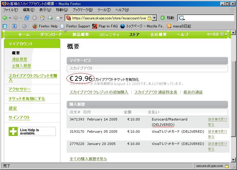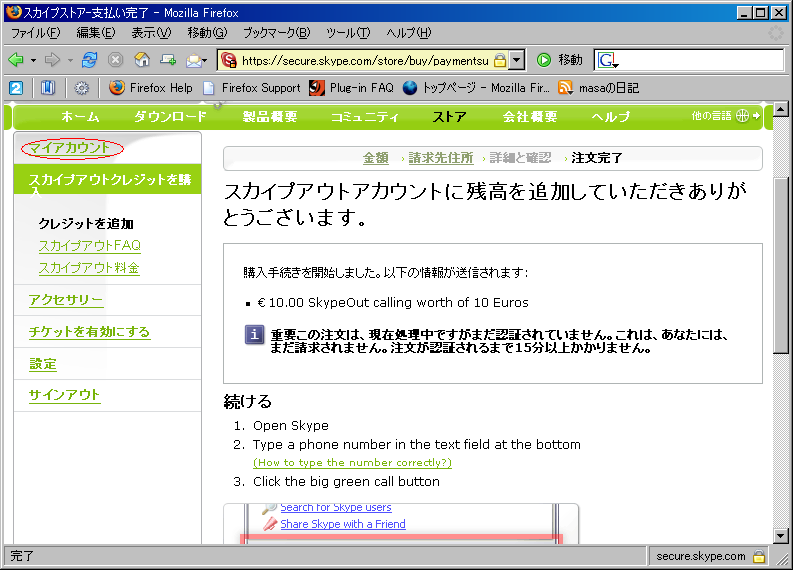 ![]() | 赤丸で囲んでいる「スカイプアウトクレジットの追加購入(又は左のマイアカウントにある「スカイプアウトクレジットを購入」)」をクリックしてください。 |