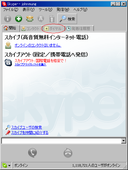 実際にSkypeを使っての掛け方を示します。 上記で示している東京にすむAさんの番号の「03−4567−****」を例にします。 赤丸で囲んでいる「ダイヤル」をクリックします。 |