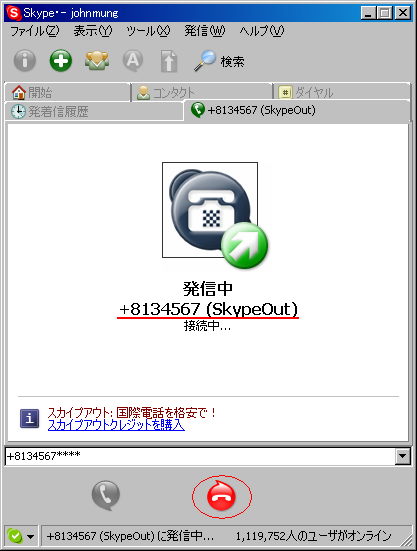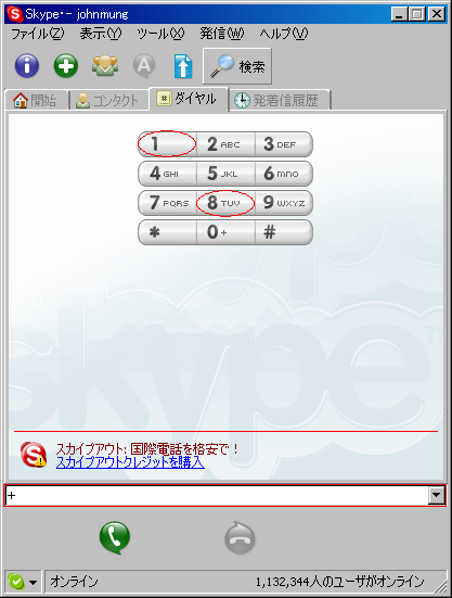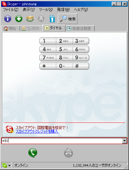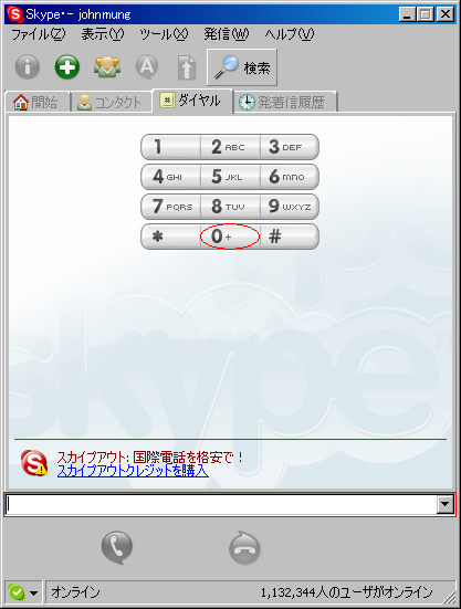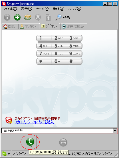 SkypeOutを利用する場合の電話の掛け方ですが、基本的にアメリカ、EU諸国から掛ける国際電話の掛け方と同じ方法です。 『「国際プレックス」「国番号」-「電話番号(市外局番-市内局番-加入者番号)」』で国際電話表記のまま入力すれば掛かります。 例えば、東京にすむAさんの番号が「03−4567−****」とします。 +81−3−4567−**** +81 3 4567 **** 00 81 3 4567 **** 011 81 3 4567 **** Bさんの携帯「090−1234−****」に掛ける場合は +81−90−1234−**** +81 90 1234 **** 00 81 90 1234 **** 011 81 90 1234 **** 基本的に、日本に掛ける場合は、0081を押した後、最初の0を除いた番号を押せば掛かります。 例では見やすいように数字の間にスペースを入れていますが、実際に掛けるときにスペースは入れなくてもよいです。 もちろん入力は半角数字(記号)です。 |